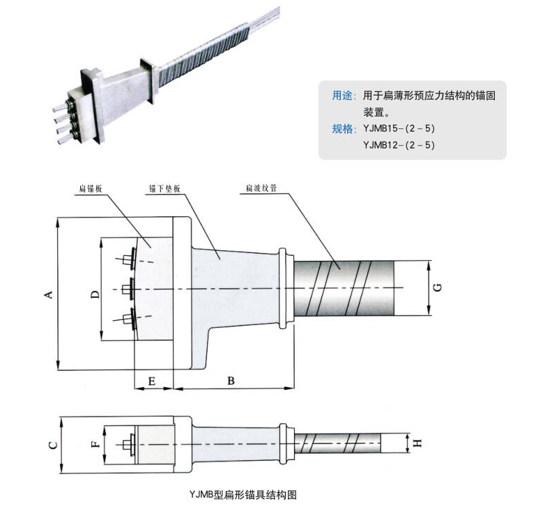該型錨具主要用于后張空心板梁或薄型混凝土結構,由夾片、扁形錨圈、扁形錨下墊板和扁形螺旋筋組成,主要結構尺寸見下圖和表2。
